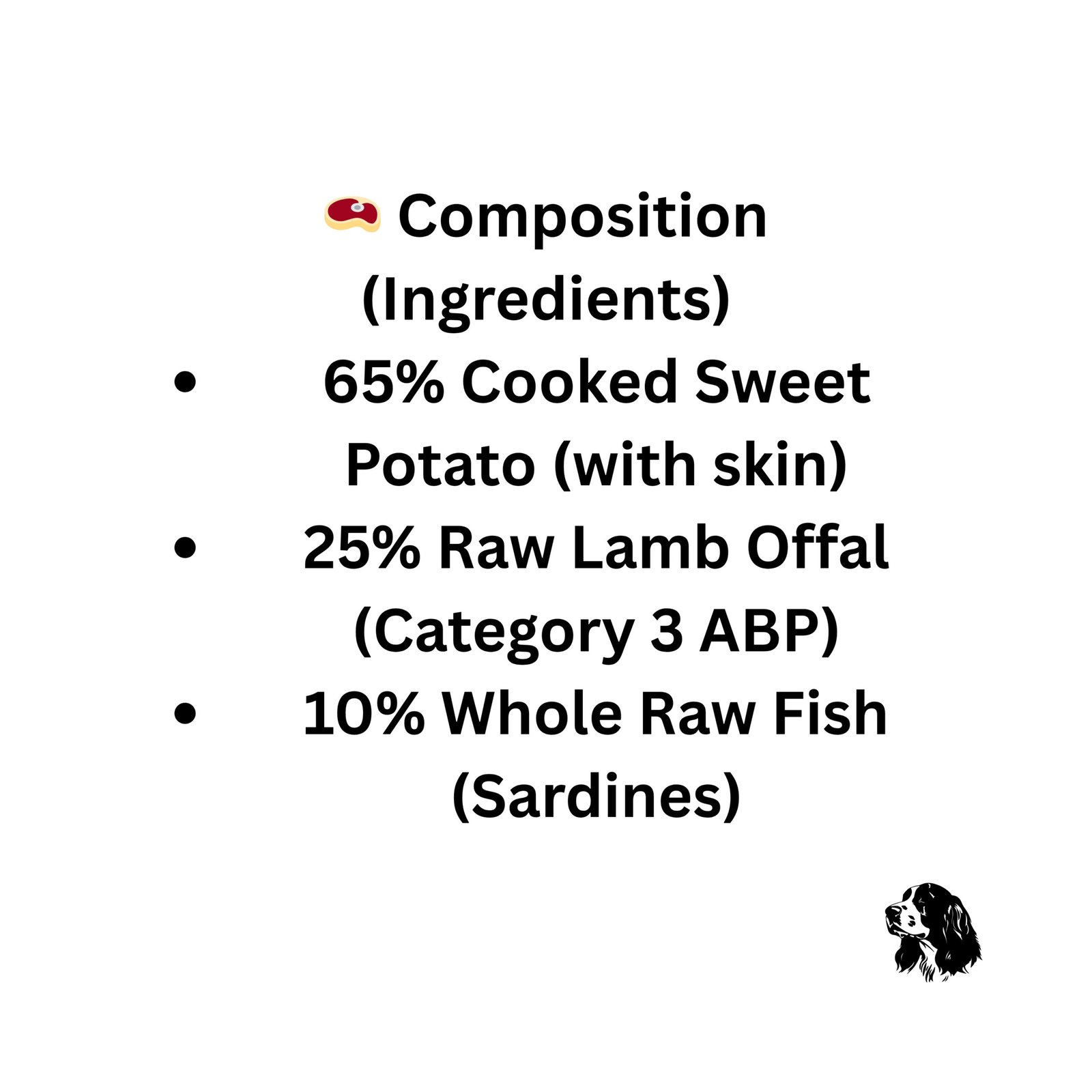 🥩 25% fresh raw lamb offal (Category 3 ABP) — a natural source of high-quality protein and essential nutrients.