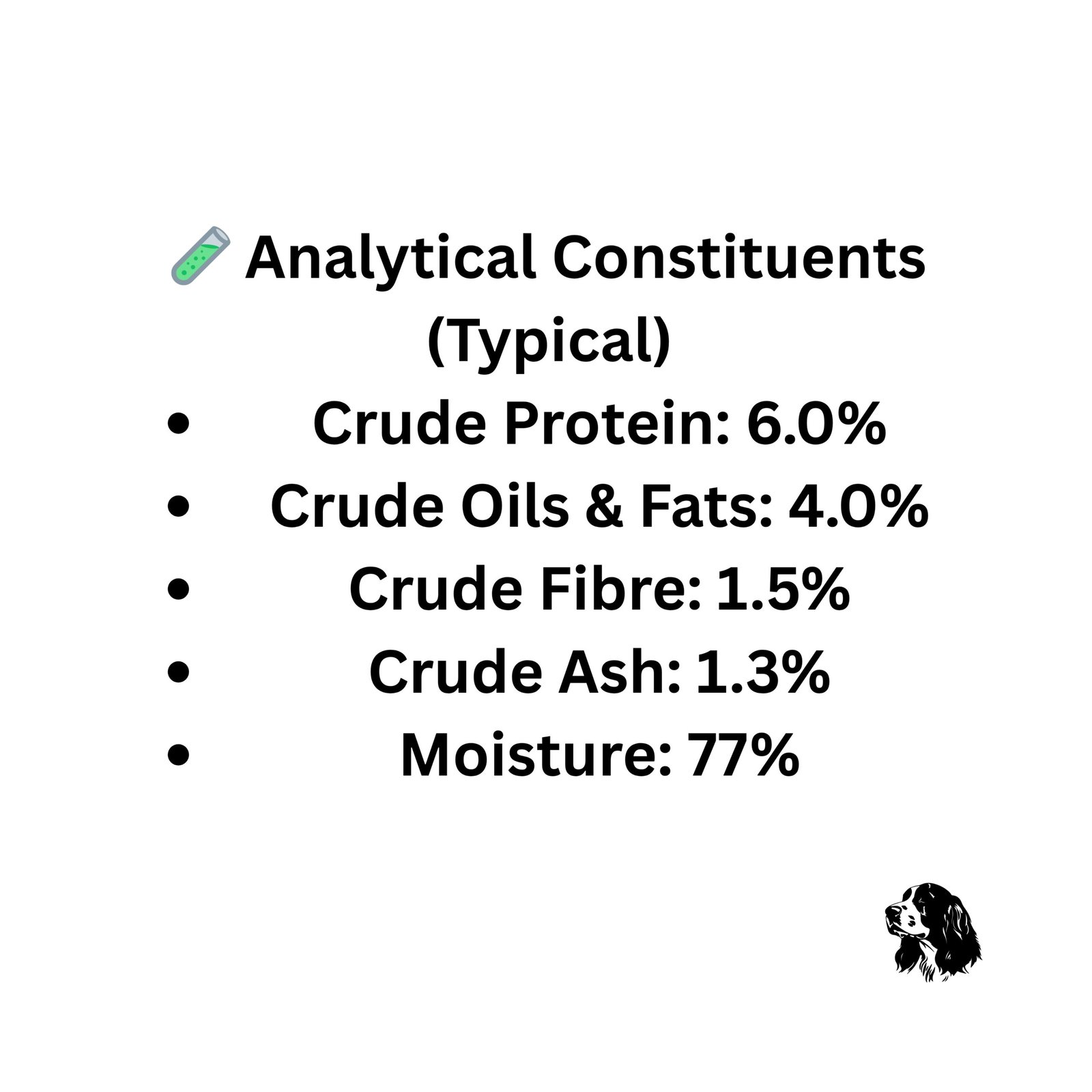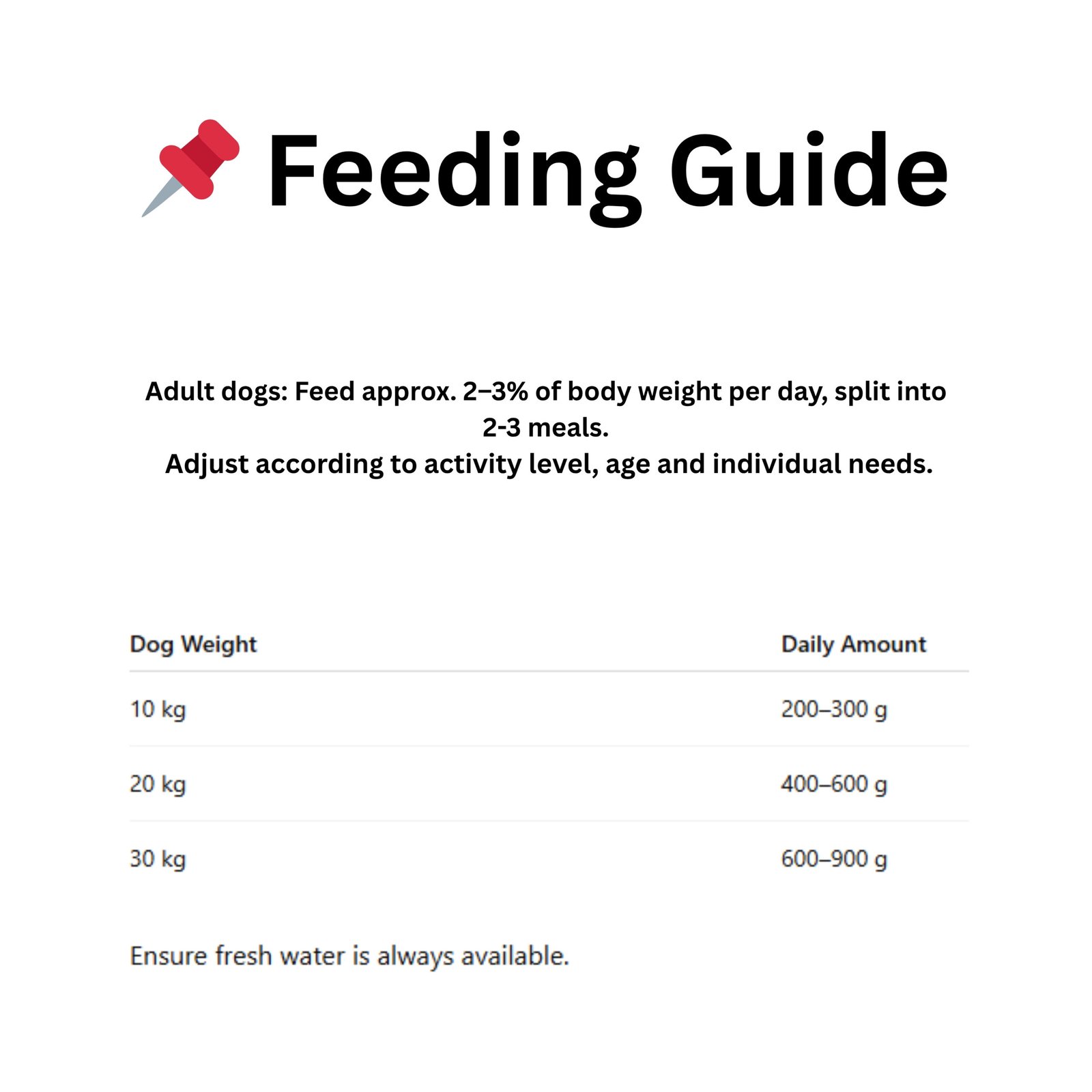 Each portion is carefully prepared, mixed and frozen to lock in freshness. We add natural supplements such as kelp powder, ground eggshell, and a FEDIAF-compliant vitamin and mineral blend to ensure this meal provides complete and balanced nutrition for your dog.